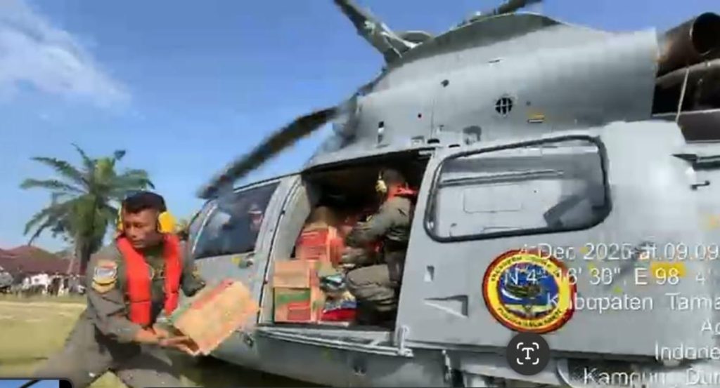 HELIKOPTER TNI AL MENDARAT DI ACEH TAMIANG DISTRIBUSIKAN BANTUAN