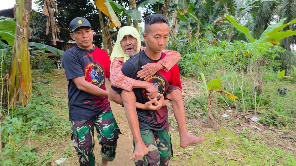 Pada titik lain, seorang kakek lansia juga berhasil dievakuasi. Prajurit menggendong korban melewati jalan berlumpur menuju lokasi aman. Penyisiran dilakukan dari rumah ke rumah untuk memastikan tidak ada warga tertinggal, terutama warga lanjut usia yang kesulitan menyelamatkan diri.