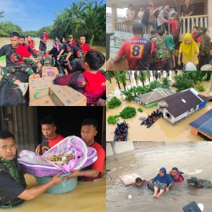 Di sebuah rumah panggung yang hampir seluruhnya terendam, warga yang menunggu pertolongan akhirnya dapat dievakuasi setelah perahu karet Marinir merapat secara bergantian. Proses evakuasi dilakukan berulang hingga seluruh warga—termasuk ibu-ibu dan anak-anak—berhasil dipindahkan ke daerah yang lebih aman.