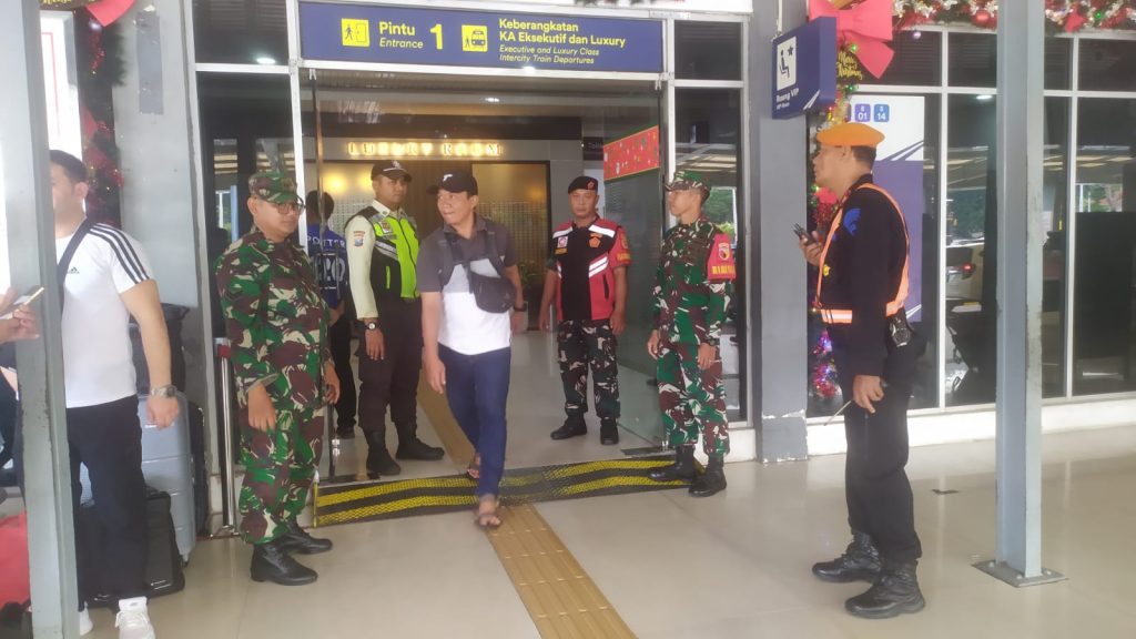 Babinsa Kelurahan Gundih Koramil 0830-04/Bubutan, Sertu Eko Wahyu Purnomo bersama Serda Dian Galuh Kurniawan, melaksanakan kegiatan pengamanan Natal dan Tahun Baru (Nataru) di Stasiun Pasarturi Surabaya, Jalan Semarang No. 1, Kelurahan Gundih, Kecamatan Bubutan.