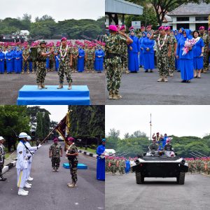 Prajurit Resimen Artileri 2 Marinir melaksanakan acara tradisi pisah sambut Komandan lama dan Komandan baru dari Kolonel Marinir Widoyono, M.Tr.Hanla., M.M., kepada Kolonel Marinir Marhabang, S.H., M.Tr.Hanla., M.M., di Kesatrian Marinir Soetedi Senaputra Karangpilang Surabaya, Senin (22/12/2025).