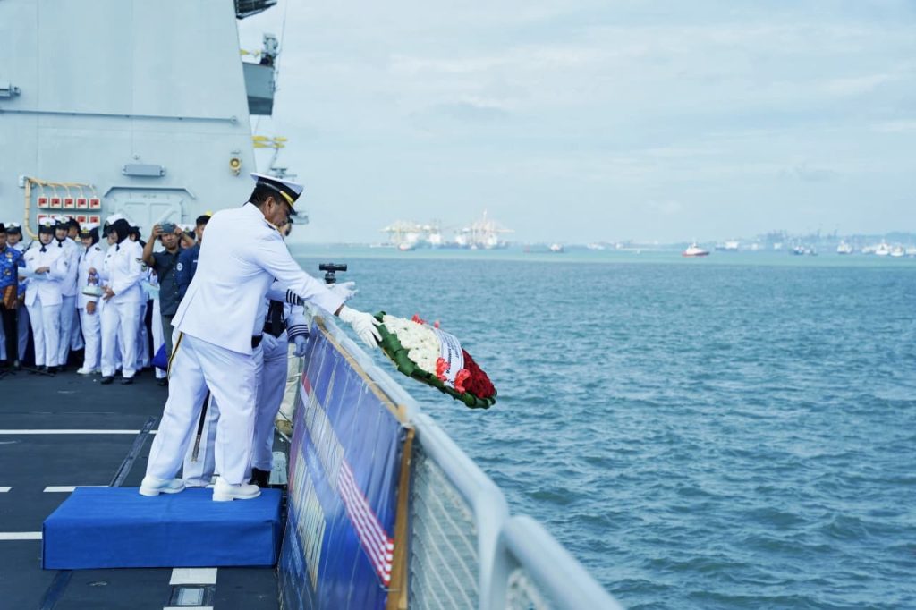 Rangkaian upacara diawali dengan penghormatan kepada arwah pahlawan, pembacaan doa, dilanjutkan dengan prosesi tabur bunga ke laut yang dipimpin langsung oleh Dankodaeral V.