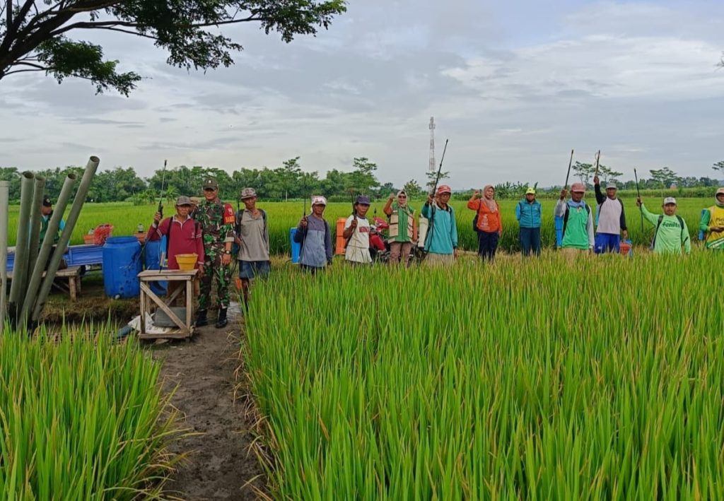 Tampak hadir dalam kegiatan tersebut POPT Kecamatan Kemlagi Prima Putri, Babinsa Desa Mojowono Serda Dedy Hertanto, PPL Desa Mojowono Wiwik beserta empat orang anggota, Ketua Gapoktan Karya Tani I Desa Mojowono Bapak Sukarjo, serta para petani setempat. (Ricky)