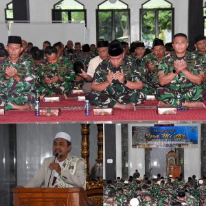 Tausiah disampaikan oleh Ustadz Ali Tamam, M.Pd.I., CPM., yang menekankan pentingnya meneladani akhlak mulia Rasulullah SAW sebagai landasan dalam membentuk karakter prajurit yang profesional, disiplin, dan berintegritas. Menurutnya, nilai-nilai keteladanan Nabi Muhammad SAW sangat relevan untuk diaplikasikan dalam kehidupan sehari-hari, khususnya bagi prajurit dalam menjalankan tugas dan pengabdian kepada bangsa dan negara.