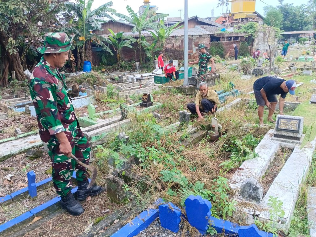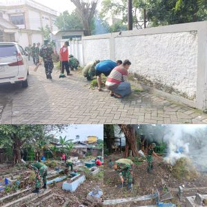 HANTANEWS Surabaya – Danramil 0830-17/Wonokromo Mayor Inf Abdul Muntolib bersama seluruh anggota Koramil serta elemen masyarakat melaksanakan kegiatan karya bakti pembersihan makam dan area sekitarnya di Kelurahan Sawunggaling, Kecamatan Wonokromo, Kota Surabaya, Minggu (8/2/2026).
