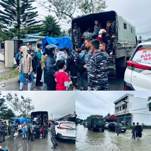 Secara bergantian, warga mulai dari anak-anak sekolah, ibu-ibu, hingga lanjut usia dievakuasi menggunakan kendaraan militer yang memiliki bodi tinggi, sehingga dapat melintas dengan aman. Prajurit Lanal Nias tampak sigap membantu warga naik dan turun kendaraan, sekaligus memastikan keselamatan masyarakat tetap menjadi prioritas utama di tengah hujan dan arus air yang masih mengalir.
