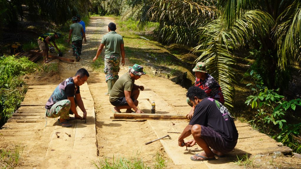 Personel Satuan Tugas (Satgas) TNI Manunggal Membangun Desa (TMMD) Reguler ke-127 Kodim 1015/Sampit mulai membongkar jembatan yang merupakan akses jalan pertanian Desa Tri Buana, Kecamatan Telaga Antang, Kabupaten Kotawaringin Timur, Kamis (05/04/2026).