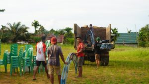 Dalam kegiatan tersebut, anggota Satgas TMMD dan warga setempat bergotong royong memotong rumput, membersihkan sampah plastik di sekitar lapangan, serta menyiapkan area yang akan digunakan untuk pemasangan tenda bagi para tamu undangan.