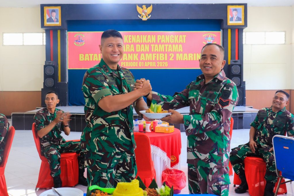 Bentuk apresiasi terhadap loyalitas, dedikasi dan kinerja para prajurit dalam mengemban tugas pengabdian kepada bangsa dan negara, Komandan Batalyon Tank Amfibi 2 Marinir Letkol Marinir Hayat Tegar, M.Tr.Opsla. sematkan pangkat satu tingkat lebih tinggi kepada Bintara dan Tamtama dalam upacara kenaikan pangkat periode 01 April 2026 di Lapangan Apel Batalyon Tank Amfibi 2 Marinir Kesatrian Marinir Sutedi Senaputra Karangpilang, Surabaya. Kamis (23/04/2026).