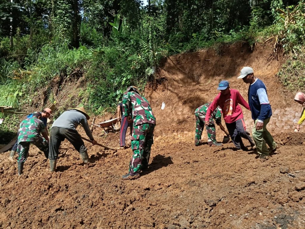 Kegiatan tersebut berlangsung penuh semangat kebersamaan. Personel TNI bersama warga bahu-membahu mengangkut dan meratakan tanah guna mendukung percepatan pembangunan jembatan yang nantinya menjadi sarana penting bagi mobilitas masyarakat.